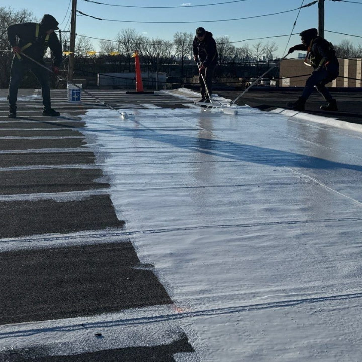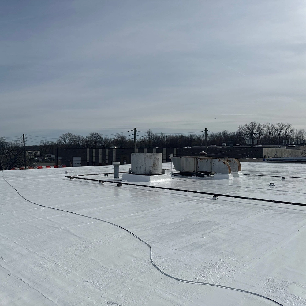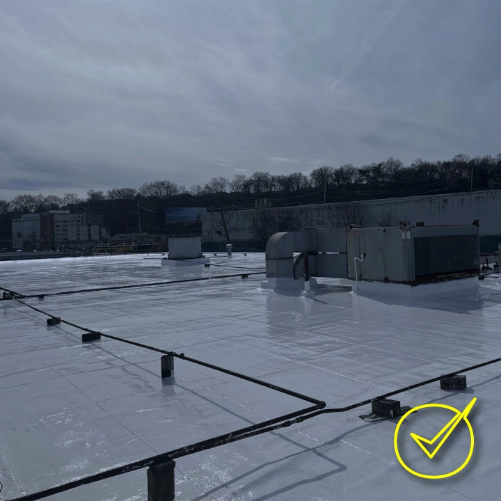 Alberto, the project foreman at our Hasbrouck Heights job, went all out on this roof rejuvenation. He inspected the entire roof and completed all major repairs using modified roof membrane. Then, he applied a full layer of coating over every square inch to ensure the surface is fully sealed and no leaks will occur. He then tackled those pesky pitch pockets, filling them with pourable sealer for an extra layer of defense. After a thorough double cleaning, the roof was prepped for a gleaming new coat of GAF acrylic hydrostop, a high-tech solution that will keep this building protected for 15-20 years to come.